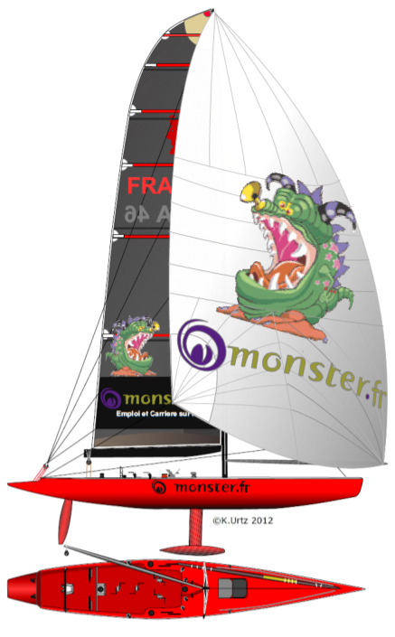 The illustration shows the old 6eme Sans FRA-46 during the first trainings of Le Defi in Lorient, FranceThe team gained as interim sponsor the MONSTER company, a particularly in Europe active recruitment agency based inFrance. On the spinnaker and themainsail perches above the company logo the "Trumpet Monster"