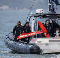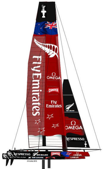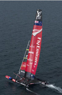 Emirates Team New Zealand beim “foiling”. Der Luv-seitige “draggerboard” ist hochgezogen.